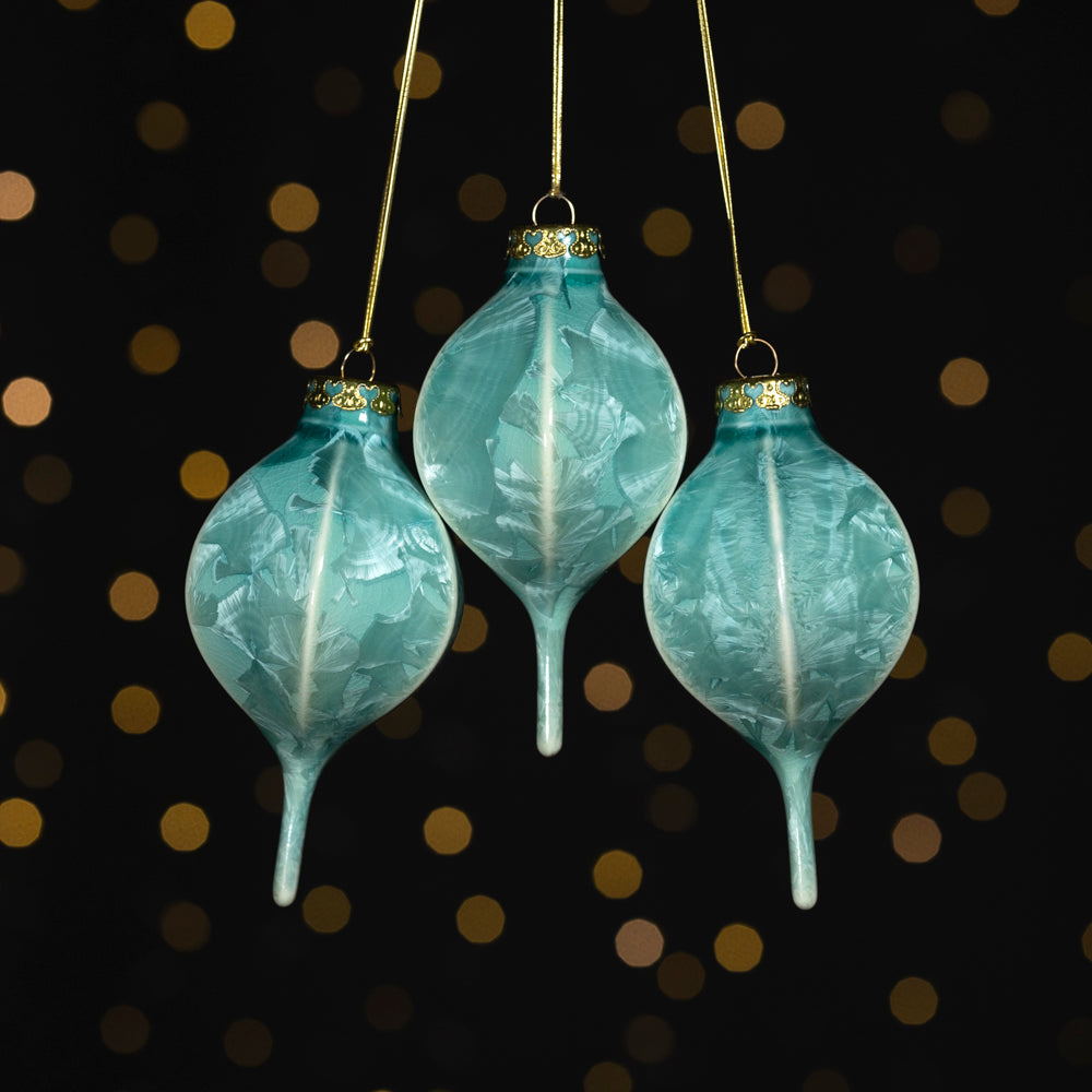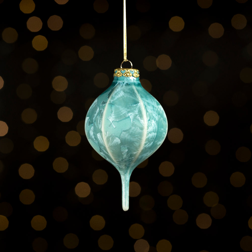 Turquoise crystalline glazed ornament with gold cap and gold cord included. Individual ornaments may vary slightly in glaze finish and number of crystals compared to photographed example due to the unique process of crystalline glazing.