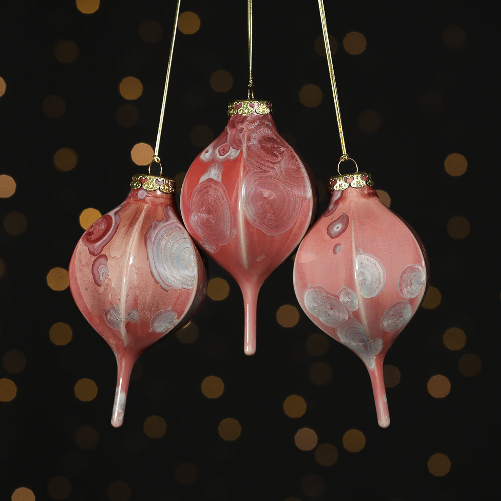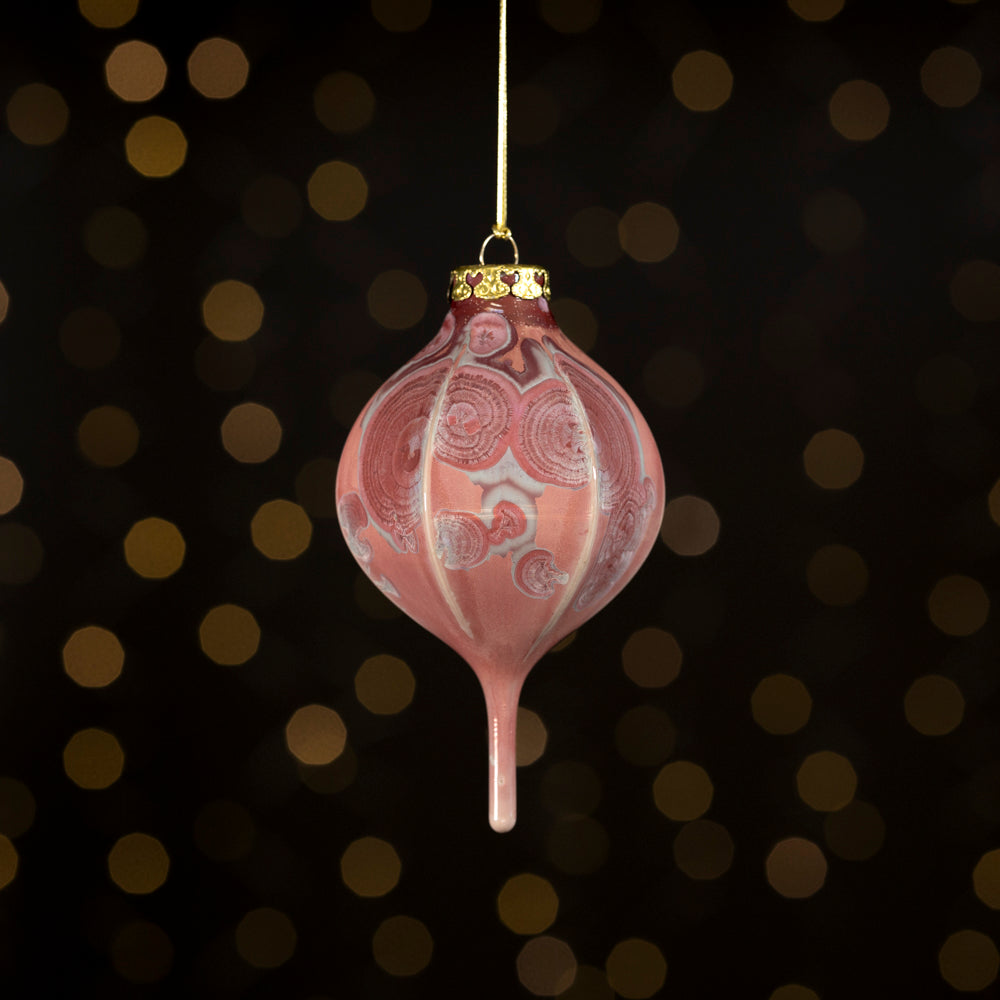 Blush pink crystalline glazed ornament with gold cap and gold cord included. Individual ornaments may vary slightly in glaze finish and number of crystals compared to photographed example due to the unique process of crystalline glazing.